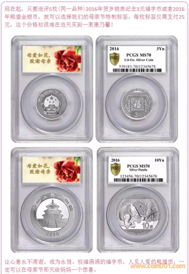 ?????? 送評5枚(同一品種)2016年賀歲3元福字銀幣或者2016年熊貓銀幣,就可選擇母親節(jié)特制標(biāo)簽。每枚標(biāo)簽僅需支付25元。