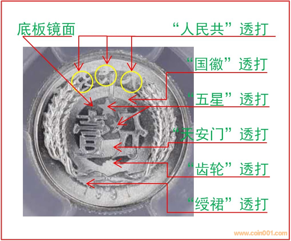 所謂空模透打幣,由于模具問(wèn)題原因,前次壓印硬幣時(shí),幣坯并沒(méi)有進(jìn)入模具壓印腔內(nèi),導(dǎo)致上下模具空腔壓印,造成上下模具凸起的高處部分輕微對(duì)撞后,在己面都留下了對(duì)面的反向痕跡或反向凹下圖紋: