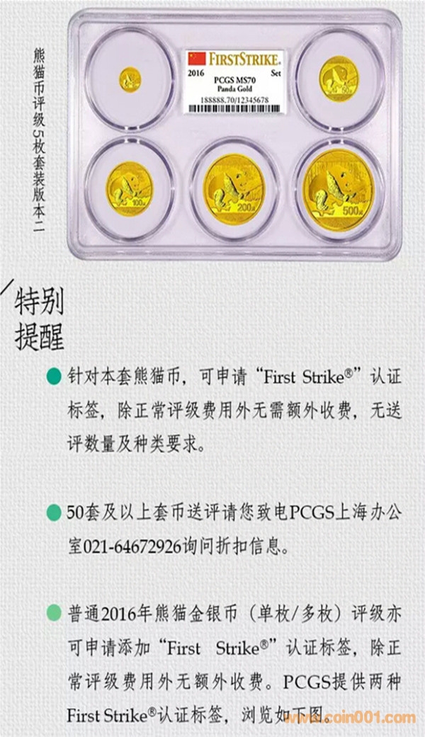 PCGS推出2016年熊貓金套裝幣及普通熊貓金銀幣(單枚/多枚)評級認(rèn)證First Strike標(biāo)簽。除正常評級費(fèi)用外無需收取額外費(fèi)用。