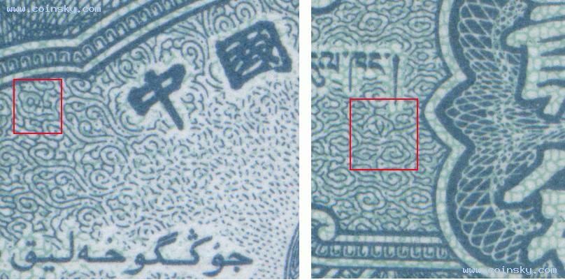 一分券關(guān)鍵是看暗記,即票面主圖上方地平線上的小房子下,無號券有一個近似“兒”字形狀的暗記,而長號券該處則是空白的。另外,長號一分券的底紋顏色偏黃些。一分的“兒”字暗記現(xiàn)在有些爭議,有人認為一些有暗記的長號券也是真的,但沒有得到多數(shù)人認同(加注:因為已經(jīng)有充足的實物為證,有“兒”的有號分幣是80后版,這個不應(yīng)該再加以否認)。所以收藏者還是應(yīng)該購買沒有暗記的長號一分,可以絕對避免買到假貨。