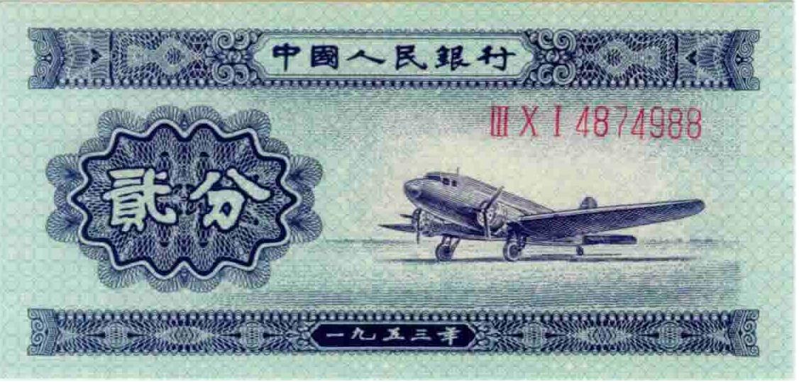 無號紙分幣2分:平印,采用國產(chǎn)紙,紙質(zhì)較薄。編號有大號碼及小號碼之分;大號碼,飛機頭上有一白點;小號碼無這一白點,為較早期印刷;相同的暗記有票背面右側(cè)藏文下有黨徽圖案;票背面行名中字左方有倒斜的“古”字樣。