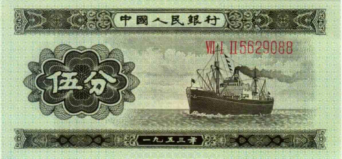 無號紙分幣5分:平印,采用國產(chǎn)紙,紙質(zhì)較薄。編號有大號碼及小號碼之分,小號碼為較早期印刷;正面輪船尾部有字母“P”“H”的字樣。