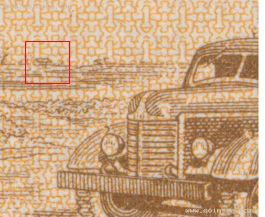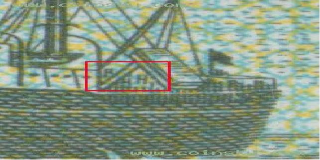 長號五分券的綠底色偏黃些,近似橄欖綠。而無號五分券則是鮮艷的草綠色。二者對比區(qū)別明顯。另外,長號五分券第一個羅馬數(shù)字的右下角恰好與輪船桅桿最上面的橫衍左端重合,而偽造品的號碼位置一般會有誤差。