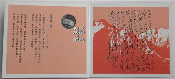 該偉人精制幣正面圖案毛澤東故居-韶山、國名、面值和年號(hào);背面圖案為毛澤東肖像及“紀(jì)念毛澤東誕辰一百周年”字樣??▋詢?nèi)分配毛澤東親筆題詩《菩薩蠻-大柏地》、《沁園春-雪》。本卡幣選用毛澤東最喜愛的朱紅色,以資紀(jì)念。