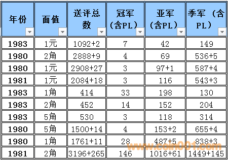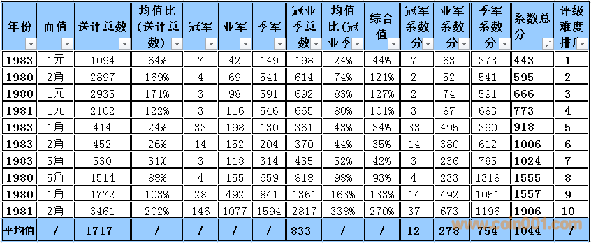 難度排序的選擇標(biāo)準(zhǔn):送評總數(shù)的平均值高于100%的普制長城幣,低于100%的數(shù)據(jù)將不體現(xiàn)在難度排序中