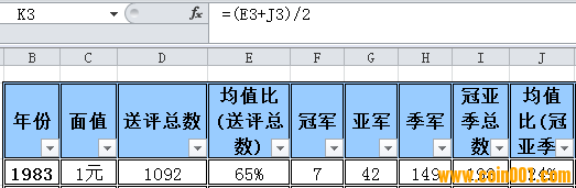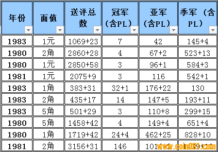綜合上面兩個問題,我建議:第一,采樣的范圍或者是統(tǒng)計的范圍要調(diào)整,應該以同材質(zhì)及同工藝為標準進行計算,即如1角、2角、5角的普制幣納入一個范圍計算,精制幣又另外一個范圍計算,當然計算結(jié)果還可以互相再比較,進而得出更多的分析結(jié)論。第二,在同一范圍內(nèi),如出現(xiàn)過的最高分即以此為冠軍分,而不是以單項最高分為冠軍分,單項如無冠軍分的則計算公式里為0.——具體的計算我還沒試過,如周版您覺得也不錯可以利用原來的計算表試算一下,看看結(jié)果是否更切合實際?