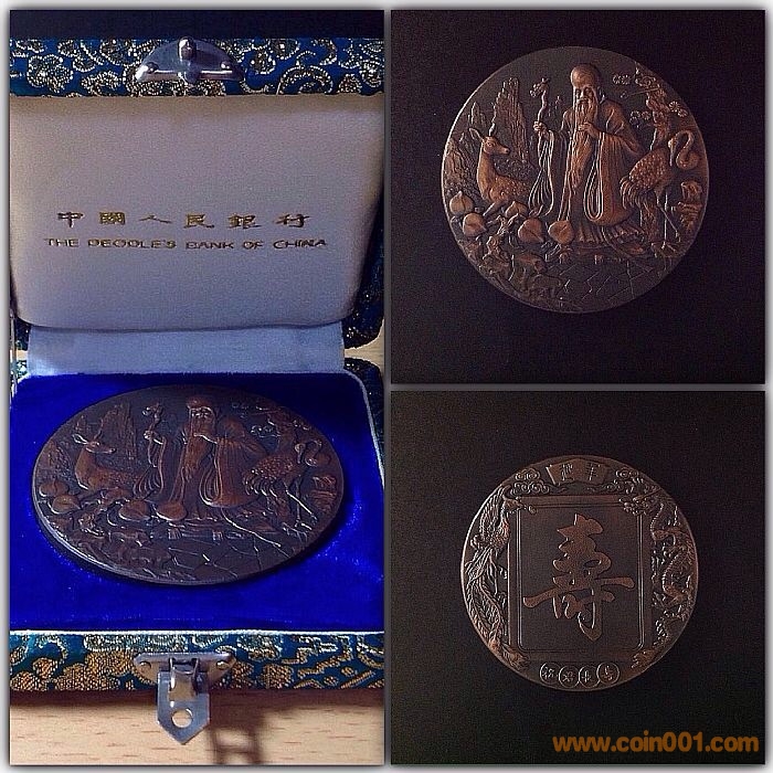 上幣廠的老壽星大銅章,所見介紹都說是1985年出品。由孫奇齡設計雕刻,直徑60mm,紫銅上色。經(jīng)了解,此章曾為中國人民銀行的禮品章,與人行版“梅花八達嶺長城大銅章”是同時期的。除了紫銅版,還有黃銅上色版,與長城章版別一致,外包裝錦盒也一模一樣?!懊坊ò诉_嶺長城章”是1980年中國人民銀行代表團首次訪問美國時的專用禮品章,是枚官方色彩濃厚的“官章”,氣勢極大;而“老壽星章”充滿了中國傳統(tǒng)文化原素,是枚吉祥寓意的“閑章”,用作禮品也合適不過。