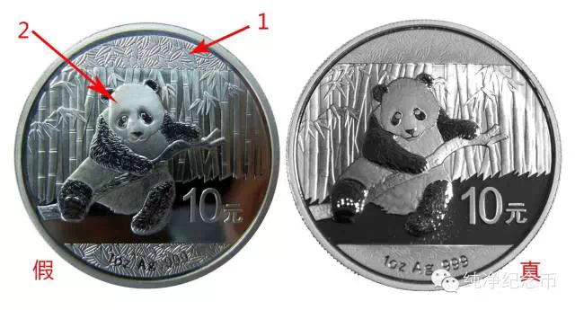 熊貓金銀幣中,由于銀幣的制假成本相對較低,防偽工藝不足,又加上熊貓銀幣的版別甚多,近期2014年熊貓1盎司銀幣高仿幣頻頻出現(xiàn)市場,價格比正常銀貓低個幾十塊,相當(dāng)具有欺騙性。