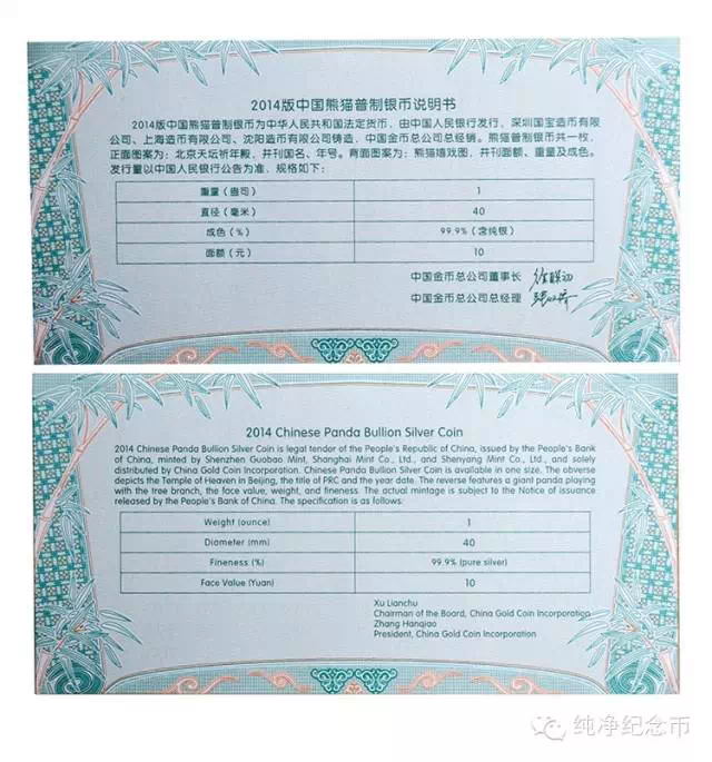 2014熊貓一盎司銀幣是沒有證書的,只有說明書。如果哪天你買的熊貓銀幣有一張證書,那么恭喜你,中獎了!?。?br />