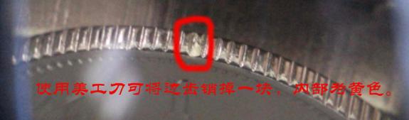 使用美工刀對銀色幣一個邊齒進行切削,將邊齒削掉一塊,使用10倍的放大鏡對切削部分進行觀察,發(fā)現(xiàn)內部為黃銅色,并且邊齒較容易切削,可以判斷邊齒材料非鐵或鎳,初步判斷為銅幣鍍鎳。為了進一步驗證其內部材料,使用150倍的放大鏡對切削處進行觀察,可以很明顯地看出表面鍍層與內部銅質的分界面。如圖所示. 見第五張圖片