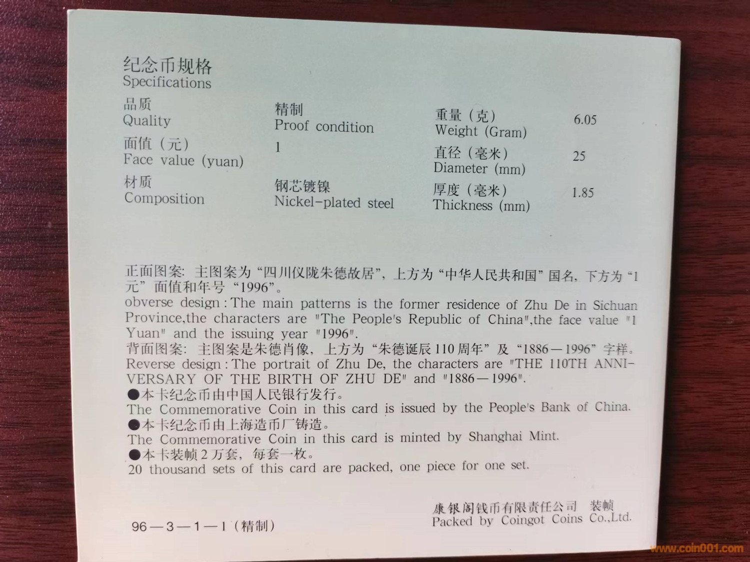 2、1996年朱德精制紀(jì)念幣,PF67UC,售2300元;