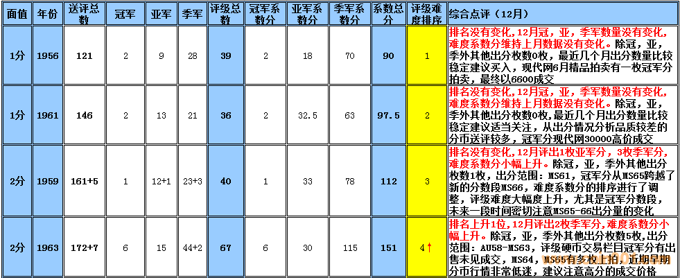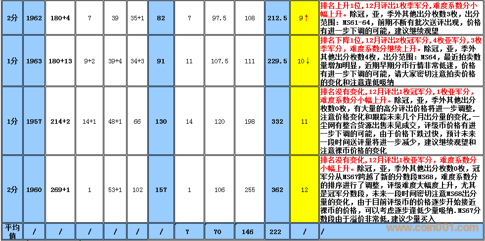 備:這個采樣的范圍會有一定的誤差,我將根據(jù)市場和評級量的變化每個季度第一周作出適當?shù)恼{(diào)整,難度系數(shù)分在未來如果超過1000分將剔除。 1960年2分在一塵有大量貨源出現(xiàn),位置由原來的第一檔次調(diào)整到第二檔次。難度系數(shù)排序暫時保留,如分數(shù)超過1000分將刪除,請大家留意!