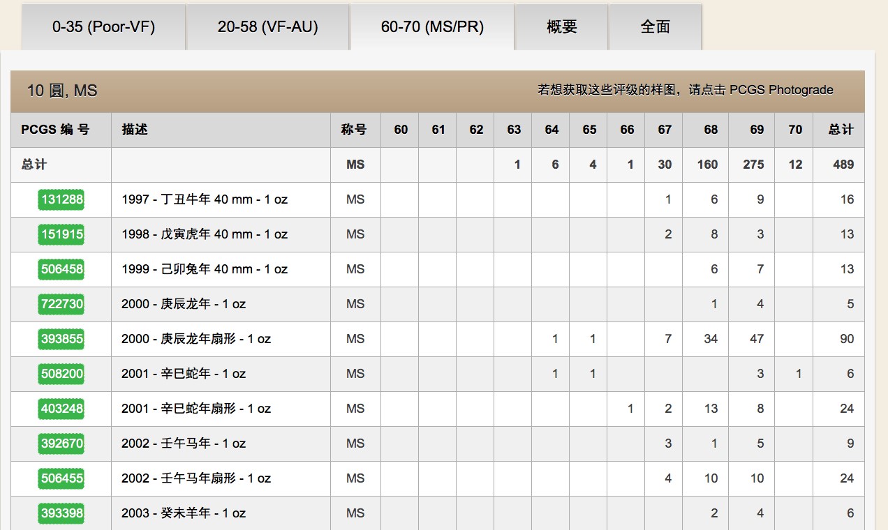 幾大板塊里的大多類別都有進(jìn)一步細(xì)分,點(diǎn)擊其中一個,即可看到根據(jù)材質(zhì)和面值劃分的下拉列表。比如,您點(diǎn)擊銀幣10元,即可看到經(jīng)PCGS封裝的各個分?jǐn)?shù)的10元銀幣數(shù)量。