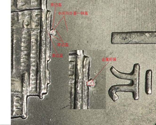 “疵點(diǎn)”微觀整體由三部分構(gòu)成,分別是中間較大的凹陷及左右兩個(gè)“小點(diǎn)”狀的凹陷。從目前“小星多屋版”整體的狀態(tài)看,“疵點(diǎn)”出現(xiàn)在布達(dá)拉宮一面工作模具末期鑄造的狀態(tài),這可以從原“雙柱”(此版本幣不存在)位置左側(cè)連廊因修模嚴(yán)重的缺失可以推斷出。