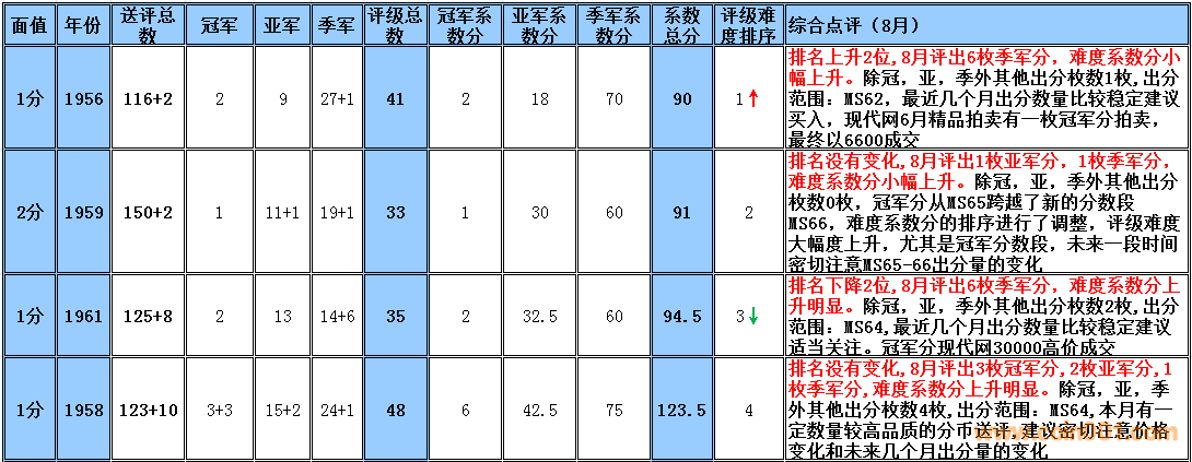 備:這個(gè)采樣的范圍會(huì)有一定的誤差,我將根據(jù)市場(chǎng)和評(píng)級(jí)量的變化每個(gè)季度第一周作出適當(dāng)?shù)恼{(diào)整,難度系數(shù)分在未來(lái)如果超過(guò)1000分將剔除。 1960年2分在一塵有大量貨源出現(xiàn),位置由原來(lái)的第一檔次調(diào)整到第二檔次。難度系數(shù)排序暫時(shí)保留,如分?jǐn)?shù)超過(guò)1000分將刪除,請(qǐng)大家留意!