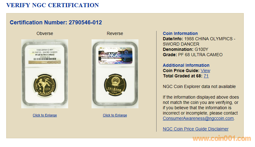 SP66分的就有121枚,和1988年女子舞劍1/2盎司金幣69分的差不多,但是價(jià)格基本都是7000元。
