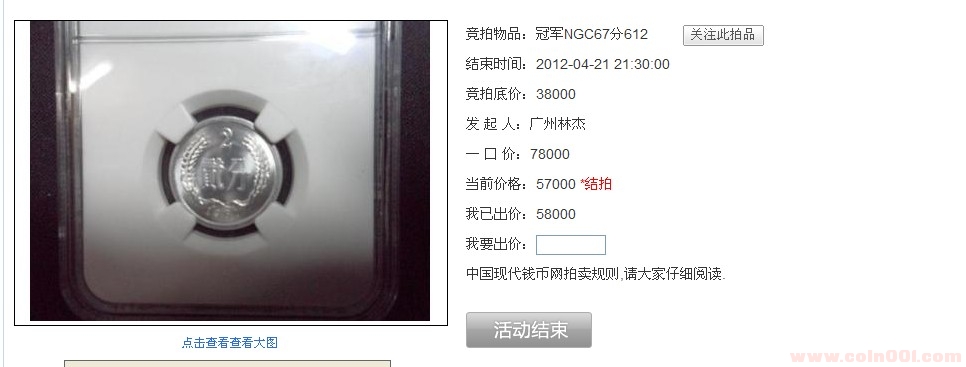 引用 引用第42樓仲雨于2012-04-24 20:34發(fā)表的 :看了鄭兄的帖子,看了大家的回復(fù)。一切先從源頭說起,先看看這枚61-2的出價(jià)記錄http://www.eetuan.com/hack.php?H_name=auction&action=detail&aid=377。??a、當(dāng)拍品的價(jià)格為49500的時(shí)候, 我委托的價(jià)格是55000。 這是拍賣記錄顯示我 51000 領(lǐng)先 2012-04-20 00:27:36。??b、隨后夜叉兄隨之出價(jià) 52000、53000、55000,但由于我委托價(jià)格時(shí)間在前,一直以55000領(lǐng)先。??c、隨后出現(xiàn)夜叉兄 在??2012-04-21 20:56:26的出價(jià) 56000 領(lǐng)先。??d、當(dāng)時(shí)我看到這個(gè)出價(jià),我心里也想了想,55000都出了,不差這1000了,再加1000試試,或許能得到次藏品。所以加價(jià)1000。但隨之發(fā)現(xiàn)57000的價(jià)格夜叉兄領(lǐng)先。所以我判定夜叉兄的委托價(jià)在60000上下,超出我的極限,所以放棄了。.......