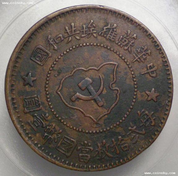 1931年11月在江西瑞金縣洋溪村正式建立了中央造幣廠,鑄造銀幣和銅幣。銅幣有:五分無島、遠(yuǎn)島、近島、連島、套島及一分六種版別;銀幣面值為貳角、有1932年和1933年2種版別。1932年版因鑄造數(shù)量少、發(fā)行時(shí)間短,存世稀少!它是我黨發(fā)行的第一套國幣,又稱‘蘇區(qū)幣’,1934年10月中央紅軍主力撤離跟據(jù)地開始長征。中華蘇維埃共和國國家銀行隨紅軍長征,即停止發(fā)行貨幣,中央造幣廠也停止鑄造。蘇區(qū)幣鑄造和流通僅兩年多,時(shí)間很短,數(shù)量很少。紅軍北上后,國民黨及其它反動(dòng)勢力,對中央蘇區(qū)進(jìn)行多次清剿,蘇區(qū)貨幣大部被毀,老區(qū)百姓俗稱‘紅軍幣’,藏在房梁上、墻縫里或用油布、羊皮包好用泥土做成磚胚狀保留下來,也有的怕遭無故連累而自行銷毀,經(jīng)過數(shù)十年的滄桑歲月,磨損消耗,能夠有幸保存下來的已寥寥無幾,尤如鳳毛麟角,紅軍幣是革命戰(zhàn)爭的歷史見證、珍貴的革命文物。它對新中國的建立以及革命的勝利起了巨大的推動(dòng)作用,它是中 國 共 產(chǎn) 黨領(lǐng)導(dǎo)中央蘇區(qū)軍民進(jìn)行政治、軍事、經(jīng)濟(jì)斗爭的歷史見證,在中國貨幣史上占有相當(dāng)重要的地位。