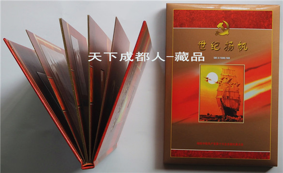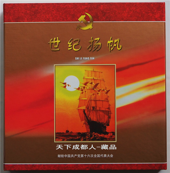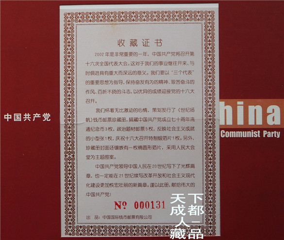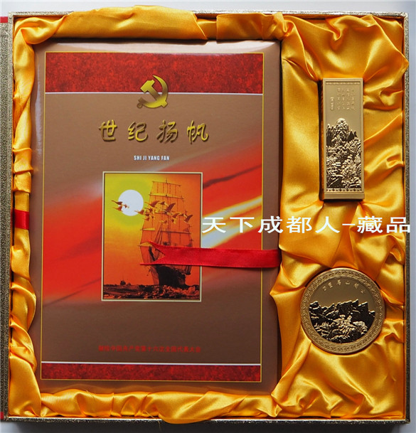 建黨題材、新穎珍藏冊(cè):2002年為紀(jì)念中國(guó)共*產(chǎn)*黨第十六次全國(guó)代表大會(huì)召開(kāi),經(jīng)中國(guó)國(guó)際錢(qián)幣郵票公司策劃裝幀發(fā)行《獻(xiàn)給中*共十六大-世紀(jì)揚(yáng)帆郵票錢(qián)幣私章盒珍藏冊(cè)》原禮盒證3幣5張郵票1枚銀箔片私章套裝盒;該冊(cè)鑲嵌一套建黨70周年紀(jì)念幣3枚、政治題材郵票5張、慶祝十六大召開(kāi)特制銀箔片1枚,另附私章及印泥盒各1個(gè);原外禮盒內(nèi)珍藏冊(cè)精美包裝,隨附帶編號(hào)收藏證書(shū)1張,以資紀(jì)念。