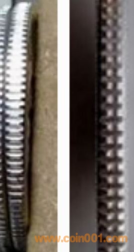 (“2013年1分硬*幣”邊部絲齒共計(jì)101顆,*大雙齒錯(cuò)幣:指101顆中的其中30-40顆絲齒呈對(duì)齒形狀,即每顆絲齒一分為二。)