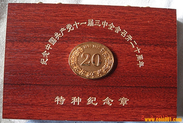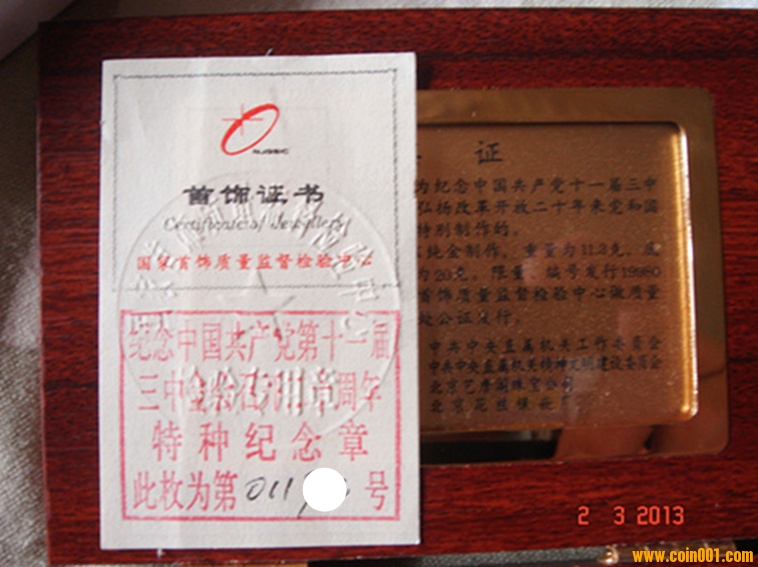 本章含純金11.3克,純銀20克,是為紀(jì)念11屆三中全會召開20周年特發(fā),限量發(fā)行19980枚,00001號由國家收藏。該章設(shè)計(jì)精美,簡潔大方,正面是改革開放總設(shè)計(jì)師鄧小平肖像,背面是“黨徽”及24K純金標(biāo)志。由于發(fā)行方式特殊,該章真品市場極少。