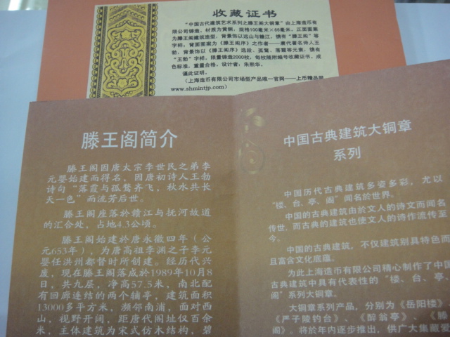 上幣廠大銅章,中國古代建筑多姿多彩,尤以“樓、臺、亭、閣”聞名于世。中國古典建筑由于文人的詩文而聞名于世,而古典的建筑他也使文人的詩作而流傳至今。為此,上海造幣有限公司經(jīng)過長期的精心準(zhǔn)備,啟動(dòng)了中國古典建筑藝術(shù)系列大銅章。該系列大銅章將分別發(fā)行岳陽樓、嚴(yán)子陵釣臺、醉翁亭、滕王閣。其中滕王閣大銅章是該系列的首枚。