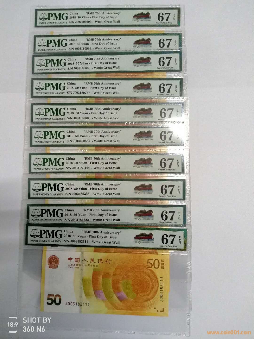 第三,送評(píng)70周年首日評(píng)級(jí)鈔,NGC官方的規(guī)定是:為符合“First Day of Issue”(首日發(fā)行)資格,紀(jì)念鈔必須在2018年12月29日,星期六上午10點(diǎn)前提交至PMG的上海辦公室。對(duì)于郵寄的紀(jì)念鈔,如郵戳日期為12月28日,且不晚于2019年1月2日送達(dá)PMG位于上海的辦公室的,也符合“First Day of Issue”(首日發(fā)行)資格。因此70周年首日評(píng)級(jí)鈔,有其一定的特殊性,在這么短的時(shí)間內(nèi)是無法找到很多好號(hào)碼的,更不要提一套一套的豹子號(hào)送評(píng)成為首日標(biāo)簽,這就是為什么很多人發(fā)現(xiàn)首日評(píng)級(jí)鈔的好的號(hào)碼不多,有些帶47的都送評(píng)了。我這套是無47 豹子號(hào)111-000 10張1套且均為67分,可以說目前我沒有發(fā)現(xiàn)有出現(xiàn)過類似于我這套的,可以說是絕無僅有,送就送唯一性,無可取代的投資收藏佳品。