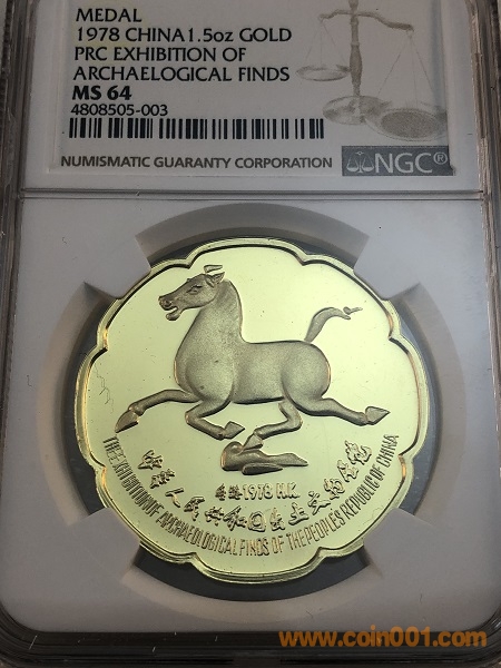 中國當(dāng)代官方貴金屬章的始祖:1978年香港 中國出土文物展覽紀(jì)念金章,正面為馬超龍雀(馬踏飛燕),背面用了著名的唐代羽人花鳥銅鏡圖案。