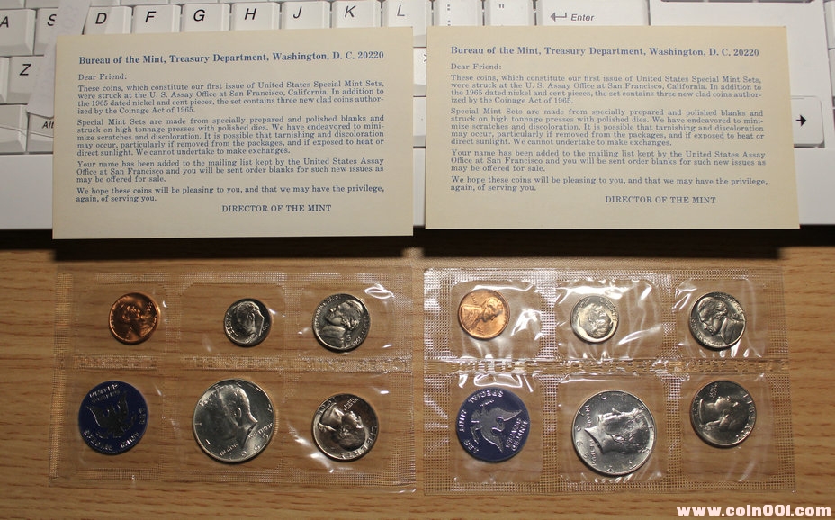 1965-1967年 是比較特殊的三年,沒有出品過Proof套,而是在三藩市鑄幣廠出品了Special Mint Set特殊工藝幣套,簡(jiǎn)稱SMS,SMS套不打S印,生產(chǎn)工藝也是特別工藝,SMS也理解成為精致套幣,krause錢幣錄都是歸在Proof Set分類底下的