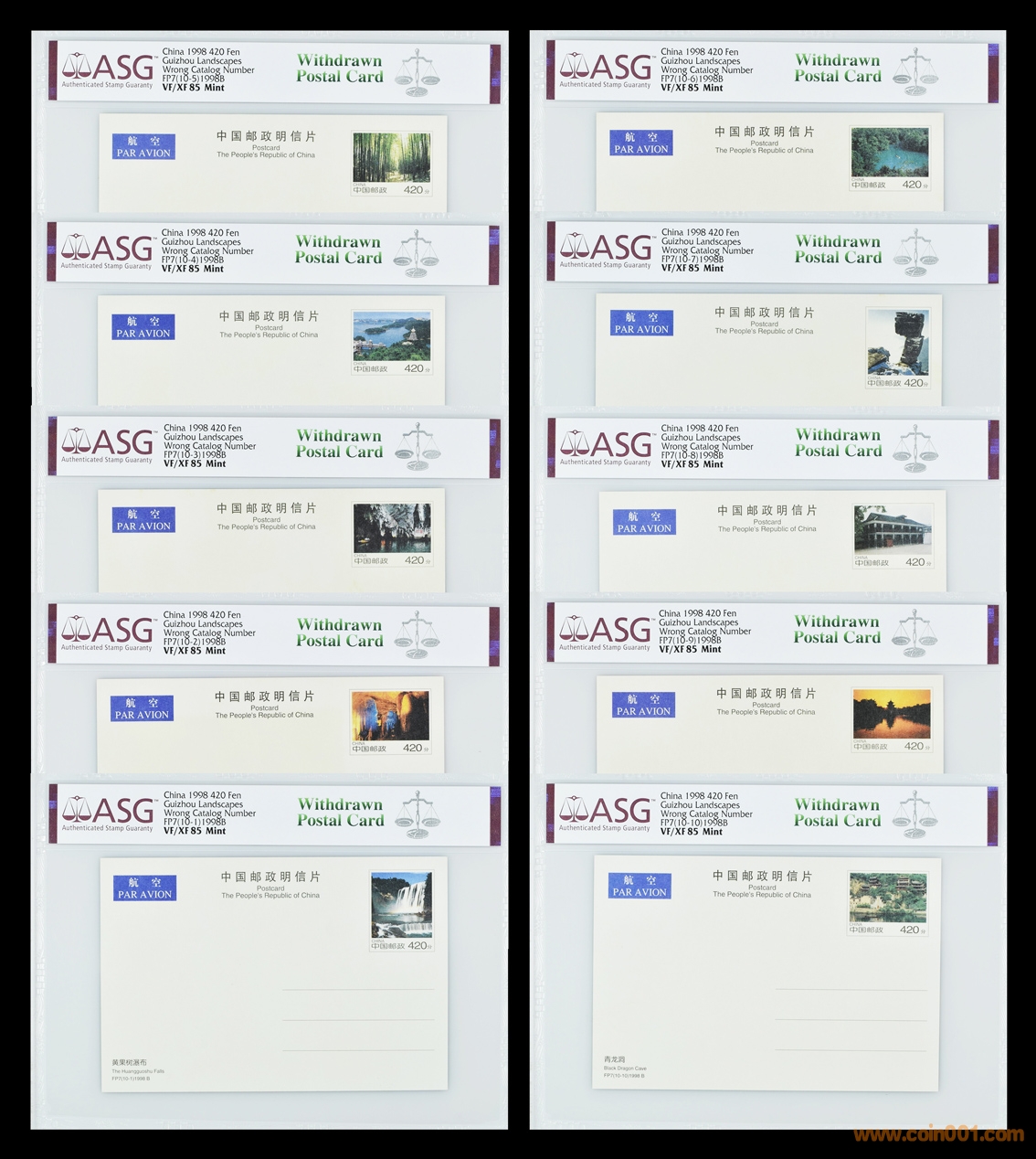 原定1998年11月25日發(fā)行的“貴州風(fēng)光”郵資片,由于重慶市和陜西省的部分郵局未遵守國(guó)家郵政局的有關(guān)規(guī)定,提前20多天就對(duì)外銷(xiāo)售。這套明信片分為A、B兩組,A組為國(guó)內(nèi)郵資,面值40分,全套10枚,售價(jià)7元;B組為國(guó)際郵資,面值420分,全套10枚,售價(jià)45元。明信片的郵票圖案和背面圖案名稱相同,分別為:(10-1)黃果樹(shù)瀑布、(10-2)織金洞、(10-3)龍宮、(10-4)紅楓湖、(10-5)竹海公園、(10-6)小七孔、(10-7)梵凈山、(10-8)遵義會(huì)議會(huì)址、(10-9)甲秀樓、(10-10)青龍洞。公開(kāi)銷(xiāo)售數(shù)日后,有集郵者發(fā)現(xiàn)“貴州風(fēng)光”郵資片的志號(hào)FP7與7月30日發(fā)行的“武陵源風(fēng)光”郵資片志號(hào)相同,便打電話向國(guó)家郵政局反映。國(guó)家郵政局接到電話后高度重視,因?yàn)榘褍商罪L(fēng)光片志號(hào)印重,就猶如把兩個(gè)人的身份證號(hào)碼弄重,以后會(huì)帶來(lái)許多問(wèn)題。如果將錯(cuò)就錯(cuò)發(fā)行,事必會(huì)給國(guó)家郵政局帶來(lái)負(fù)面影響。在11月6日接到電話的當(dāng)天下午,國(guó)家郵政局電傳全國(guó)各省、市區(qū)郵政局,通知停止銷(xiāo)售FP7“貴州風(fēng)光”郵資片,并命令必須于11月18日前全部上交總局銷(xiāo)毀。隨后,重新印制了正確志號(hào)的FP8“貴州風(fēng)光”郵資片,并在當(dāng)年11月25日發(fā)行。