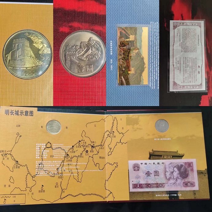 冊內(nèi)含1980年人民幣紙幣1元、2002年文化遺產(chǎn)萬里長城紀(jì)念幣、1985年長城1元硬幣,