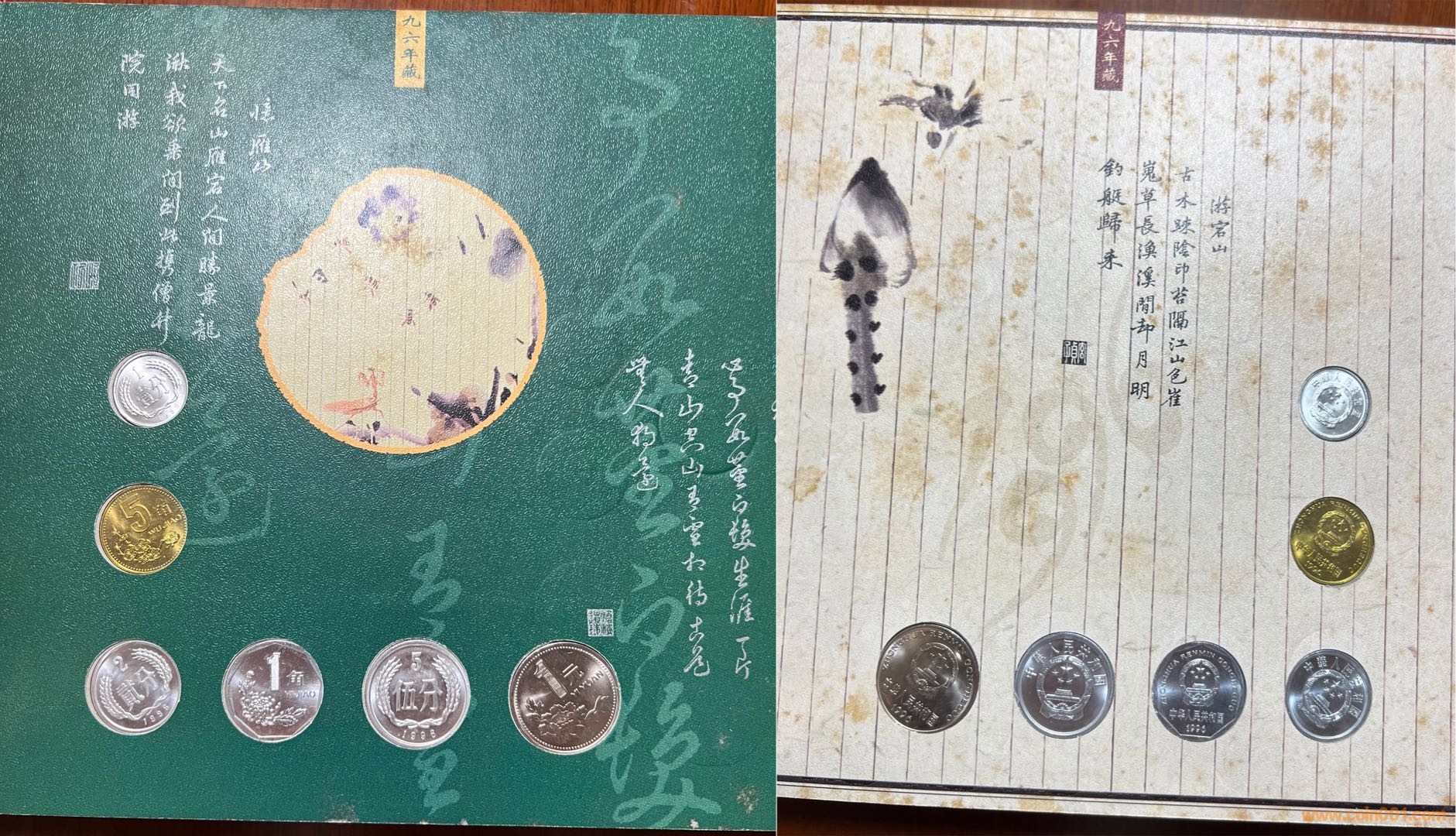 今從本網(wǎng)站、他網(wǎng)站偶得金、銀版《碎銀閑趣》數(shù)冊,“冊中詩文水墨與閑銀碎幣巧妙融合,無不浸透生活點滴帶來的閑情逸致和人生感悟,全冊詩情畫意,讀來趣味盎然”。上海老藏家印先生的除外包裝略微有些陳舊,其余品相精美,金冊與一市場常見略有差別,冊邊為銀色,91年、92年硬幣放置布局與常冊有異?!端殂y閑趣》發(fā)行于2000年,距今有23年了,我關注此冊也有15、6年了,但從發(fā)行到現(xiàn)在,關注度一直不高,各網(wǎng)站售賣的冊中硬幣也常常留有指紋,細微之處可見當時工人裝幀時的漫不經(jīng)心?!端殂y閑趣》裝幀的每枚硬幣、每張紙幣都熠熠生輝!