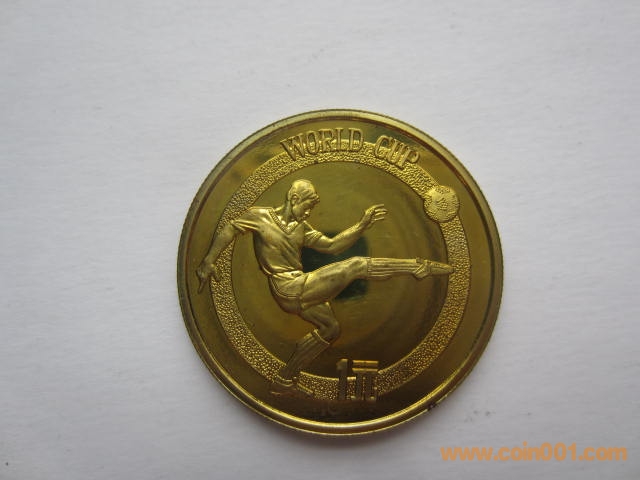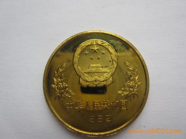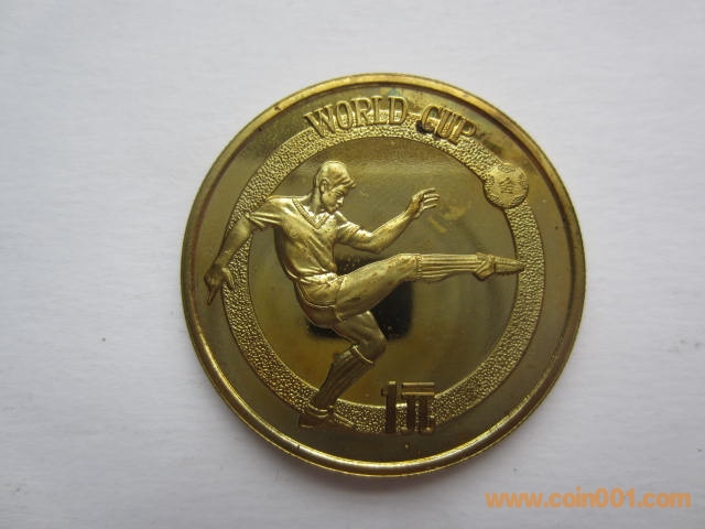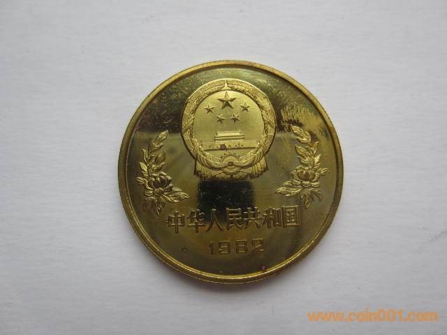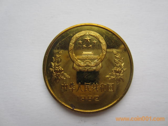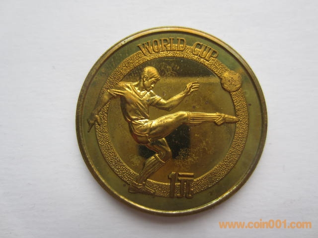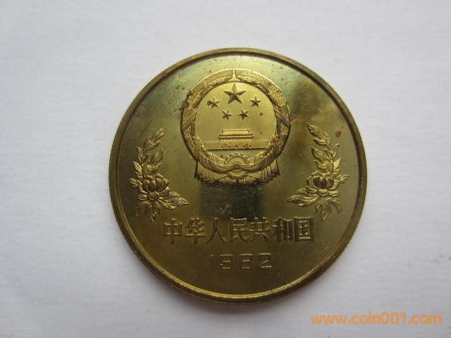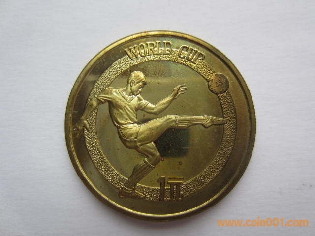 1982年12屆世界杯足球賽紀(jì)念銅幣。該幣于1982年發(fā)行,1套1枚,面值1元,直徑32毫米,重11.9克,鑄造40160枚。正面圖案:國徽、裝飾花卉、“中華人民共和國”國名及“1982”發(fā)行年號(hào)。背面圖案:為一男足運(yùn)動(dòng)員射門雄姿,內(nèi)緣上方鑄英文“WORLD CUP”(世界杯),內(nèi)緣下方鑄“1元”面值