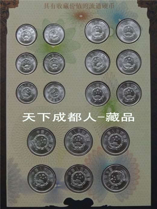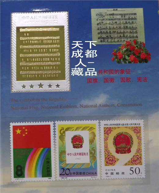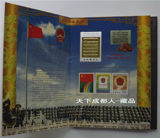 該珍藏冊(cè)內(nèi)含郵票類14張(與共和國象征有關(guān)的國旗、國徽、國歌和憲法等郵票);長城套幣3枚(85年版壹元、伍角和壹角各1枚);硬分幣18枚(壹分年號(hào)77、83、85、86、87和91年;貳分年號(hào)84、85、87、88、89和90年;伍分年號(hào)86-91年各6枚);紀(jì)念磁卡3張(正面為三偉人圖片、背面為偉人各歷史階段重要文獻(xiàn)資料);紀(jì)念鍍金箔片1張。建國題材、郵幣卡章合一裝幀新穎;具有較高紀(jì)念收藏價(jià)值(品如實(shí)物圖):