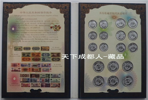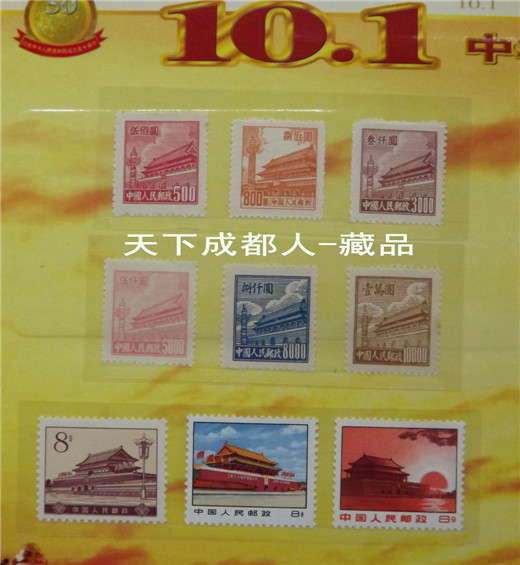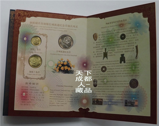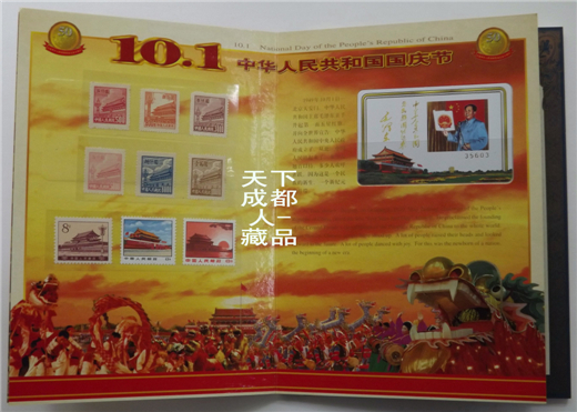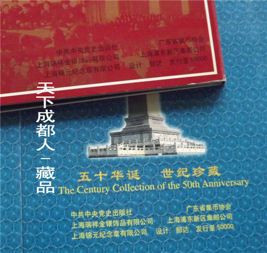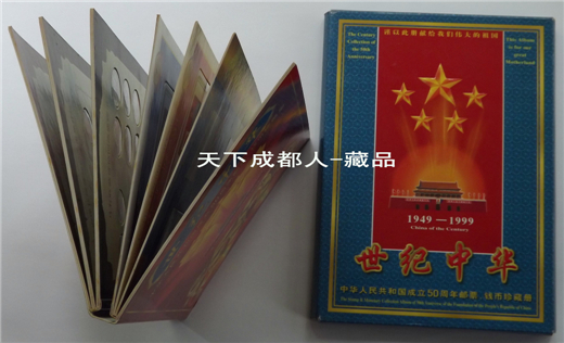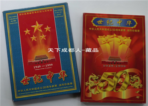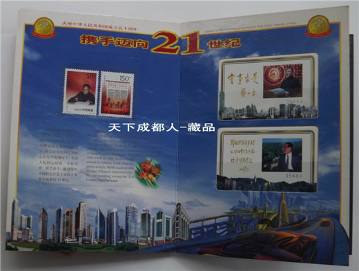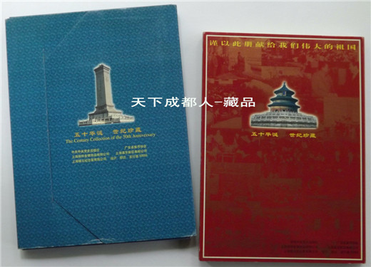 郵幣卡章裝幀冊(cè):1999年10月中共中央出版社、廣東省錢幣協(xié)會(huì)、上海錦元紀(jì)念章有限公司等聯(lián)合裝幀發(fā)行《中華人民共和國50周年郵幣卡珍藏冊(cè)》原外封套硬幣21枚郵票14張紀(jì)念磁卡3張鍍金箔片1張。該珍藏冊(cè)分別含郵票、硬分幣、長城幣、紀(jì)念章和紀(jì)念磁卡共五種藏品,紀(jì)念冊(cè)設(shè)計(jì)者:郁達(dá)先生,限量5萬冊(cè);原外封套內(nèi)折式精美裝幀(磁卡統(tǒng)一編號(hào)35603),各錢幣原光品相,以資紀(jì)念。