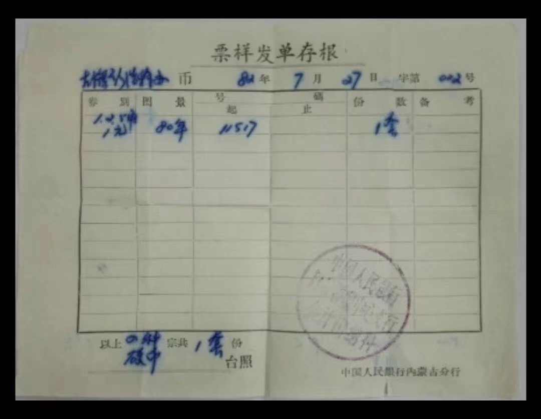 在2020年5月1日微信公眾號長城幣愛好者聯(lián)盟一篇題為說說1980年小黑樣幣的文章(作者:半島鐵盒)中,提到了一張《票樣發(fā)單存根》,發(fā)單記載的內(nèi)容為:【左旗新浩特辦,82年7月27日,字第0*2號,樣幣號碼是11517,份數(shù)1套,中國人民銀行內(nèi)蒙古分行等字樣和“中國人民銀行*****中心支行會計出納科”的印章】。