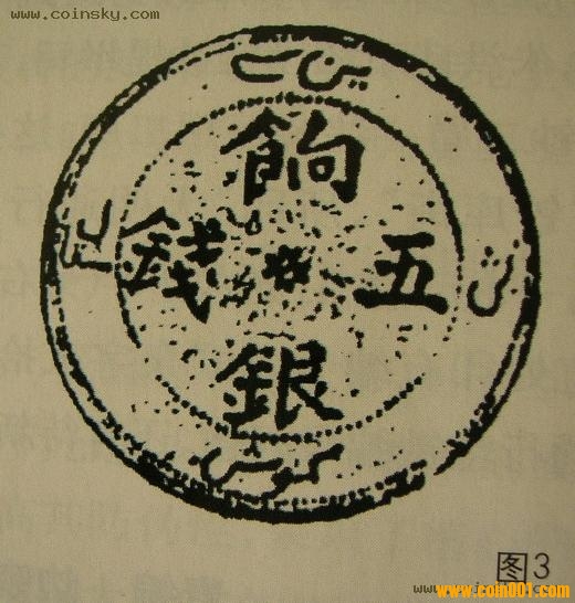 圖3所示為“‘餉’字錯(cuò)版銀幣”。清光緒三十三年(1907年)新疆鑄造“餉銀”錢幣。其中一種正面珠圈內(nèi)為漢文“餉銀五錢”4字,珠圈外為維文“餉銀五錢”,背面為線圈蟠龍,左右各有一小花。該幣正面漢文“餉”字的“食”旁少了最后一筆,成為“餉”字錯(cuò)版。