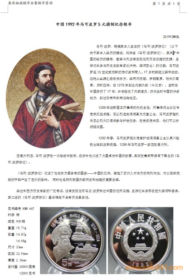 中國1992年馬可波羅5元 ..