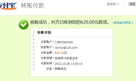 引用 引用第513樓雙鳳朝陽于2012-10-06 13:52發(fā)表的 : 再加3本孫老師新書簽名本,款已付支付寶,請查收。一共是15本。謝謝。
