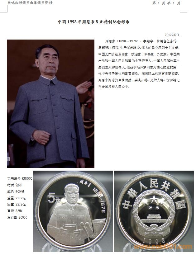 中國1993年周恩來5元精 ..