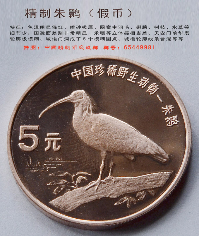 ????? ?圖紋不清??有圖案的一面,假幣的動物羽毛和翅膀等部位缺少細(xì)節(jié),華南虎幾乎不見虎須,朱鹮幾乎沒有水草,國徽年號一面更是區(qū)別非常明顯,禾穗立體感很差,天安門城樓前面的華表輪廓非常模糊幾近消失,城樓下5個門洞成了5個模糊圓點(diǎn),城樓輪廓也線條含混,這一面即使跟普制幣比,立體感和線條銳度都相差太多