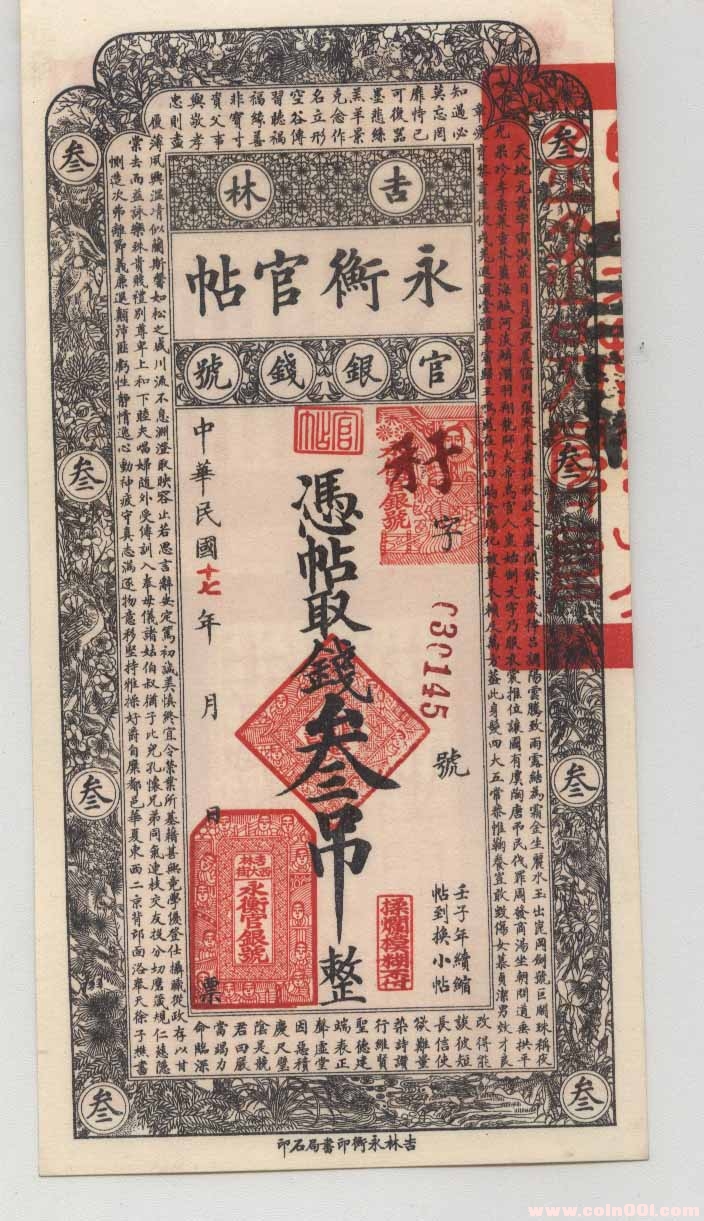 光緒二十四年(1898年),吉林將軍延茂為抵制羌帖,制止私帖泛濫,在吉林省城創(chuàng)設永衡官帖局,開始發(fā)行吉林官帖?!坝篮狻倍譃榍蟆笆袃r永久衡平”之愿。延茂于光緒二十五年啟奏關于吉林永衡官帖局的奏文中說:“……由庫存六分平奏留接濟俸餉下暫借三萬兩墊辦作本,以資輾轉。官帖鈔數(shù)仿照銀元鈔數(shù)開使,分為五等,六千六百文遞減至四百四十文,將帖發(fā)商行使。其赴局以元易帖,以帖換元者,悉聽其便。局中不準到行買賣現(xiàn)銀、現(xiàn)鈔,以防侵奪商利,滋生弊端。現(xiàn)行使一年,商民稱便,流通頗廣,可與銀元同用?!?br /> 吉林永衡官銀號(永衡官帖局),從1898年創(chuàng)立至1931年“九.一八”事變被日本帝國主義吞并,歷時33年。在半殖民地半封建金融體制下,走過艱辛、坎坷的歷程。期間一直執(zhí)行地方中央銀行之職能,代理省金庫,發(fā)行紙幣。對改變吉林省經(jīng)濟,抵御外幣,促進地方商品經(jīng)濟的發(fā)展,發(fā)揮了積極的作用,其影響和作用將永遠載入中國近代金融史史冊。其所發(fā)行的主要貨幣永衡官帖,形制獨特,圖案精美,集詩、書、畫、印為一體,成為一幅完美的中國畫卷,它不僅是商品流通的媒介,還是一件精美的藝術品。