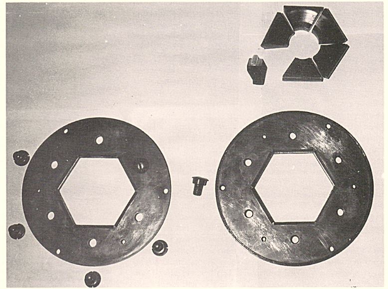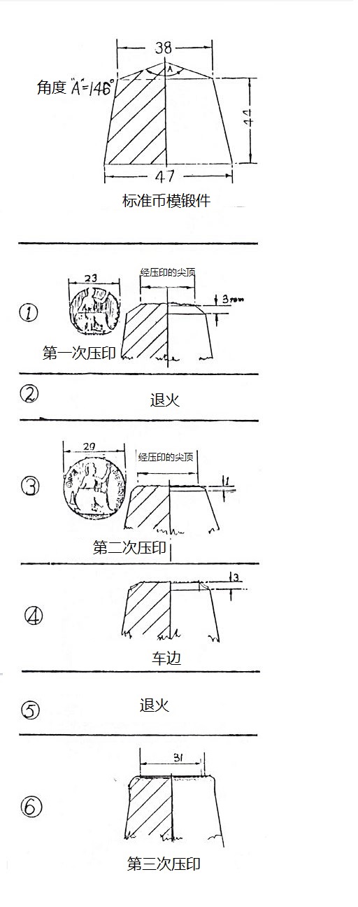 圖168 工作模翻制的幾個步驟。(1) 第一次壓??;(2) 退火;(3) 第二次壓??;(4) 形成圓臺;(5) 重新退火;(6) 第三次(最后)壓印。(1) 和 (3) 中的小圖是黑白示意圖,因而是陽紋,而不是工作模上應(yīng)有的陰紋。
