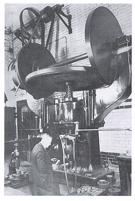 圖 170 上 – 倫敦皇家造幣廠內(nèi)的 250 噸大型 Greenwood and Batley 翻模壓機(jī);下 – 操作工準(zhǔn)備翻模時在壓機(jī)內(nèi)握住模坯和二元模