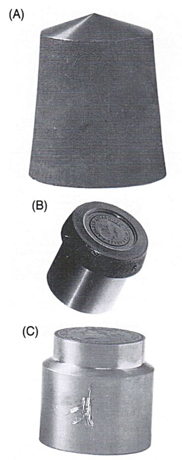 圖169 A 拋光的錐形幣模鍛件,幾十年一直保持不變;B 壓制完成的鍛件,已經(jīng)過部分車床加工;C 工作模成品