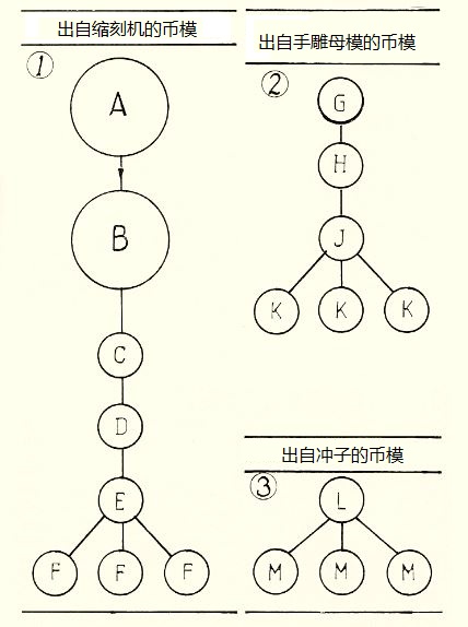 (1):A 藝術(shù)家浮雕石膏模的陰模;B 用 A制作的陽模,用鑄鐵或青銅制成,后來被電鑄版取代; C 縮雕機(jī)制成的鋼質(zhì)陽模; D 用 C 壓印而成的鋼質(zhì)陰紋母模; E 用 D 壓印而成的陽紋父模(又稱二元模); F 用 E 壓印而成的陰紋幣模。(2):G 陽紋沖子,用于中心圖案;H 用 G 壓印而成的母模,通過手工雕刻加上其余成分;J 陽紋二元模;K 陰紋幣模。(3):L 陽紋沖子;M 陰紋幣模,通過手工雕刻加上其余成分。