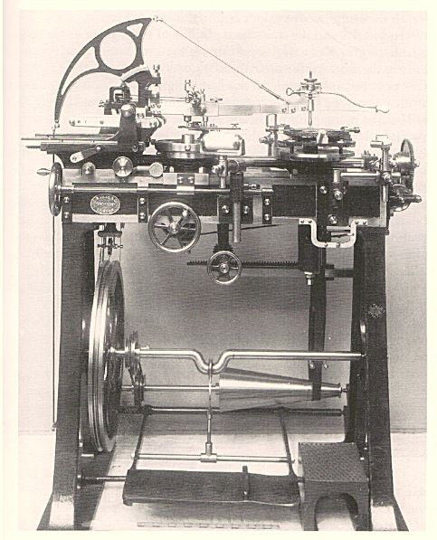 十九世紀(jì)晚些時候,有人發(fā)明了一種特殊的裝置來驅(qū)動翻模壓機(jī),圖 170。由皮帶傳動的一根橫軸被裝在一個飛輪的上方,而飛輪被固定到主螺桿的頂端。飛輪取代了搖臂。沿飛輪邊緣挖出一道凹槽,皮革條被嵌入槽中以形成一個摩擦驅(qū)動面。而橫軸的兩端則各安裝了一個圓盤。橫軸被設(shè)計為可以橫向移動,讓兩個圓盤中的一個來摩擦飛輪的邊緣。這樣操作工就能夠根據(jù)不同圓盤提供的動力,隨意將螺桿升起或降下。操作工用腳控制飛輪,讓螺桿上的飛輪停留在所需的任意高度,然后按照所需的壓力讓螺桿落下。主夾具被安放在壓機(jī)開合處的基座上,雕刻圖案的一面朝上,而錐形的模坯則被用手垂直抓住,錐形的尖端頂在圖案的中心。然后螺桿被壓下,撞擊在模坯根部。這類壓機(jī)增大了壓力,對經(jīng)過硬化處理的陽模和陰模都會產(chǎn)生更大的沖擊力,因此就有必要將陽模和陰模放在一個安全環(huán)套里,防止它們爆裂。為了保護(hù)操作工的手,還在壓機(jī)內(nèi)加放了一個止動塊,也就是一個墊塊,以限制螺桿向下移動的行程。在圖170 中,操作工正在準(zhǔn)備對陰模進(jìn)行二次或更多壓印。為此目的,陰模被裝入主夾具內(nèi),然后裝好陰模的主夾具被置入壓機(jī)的開合處。這項工作并非易事,因為兩個帶有圖案的表面必須精確對正,而且不得有損壞。還要給兩個表面之間加上潤滑劑,而這些潤滑劑通常是操作工口中吹氣所含的水分!操作工身邊的小型手工壓機(jī)被用來將幣模壓入安全套環(huán)內(nèi)。