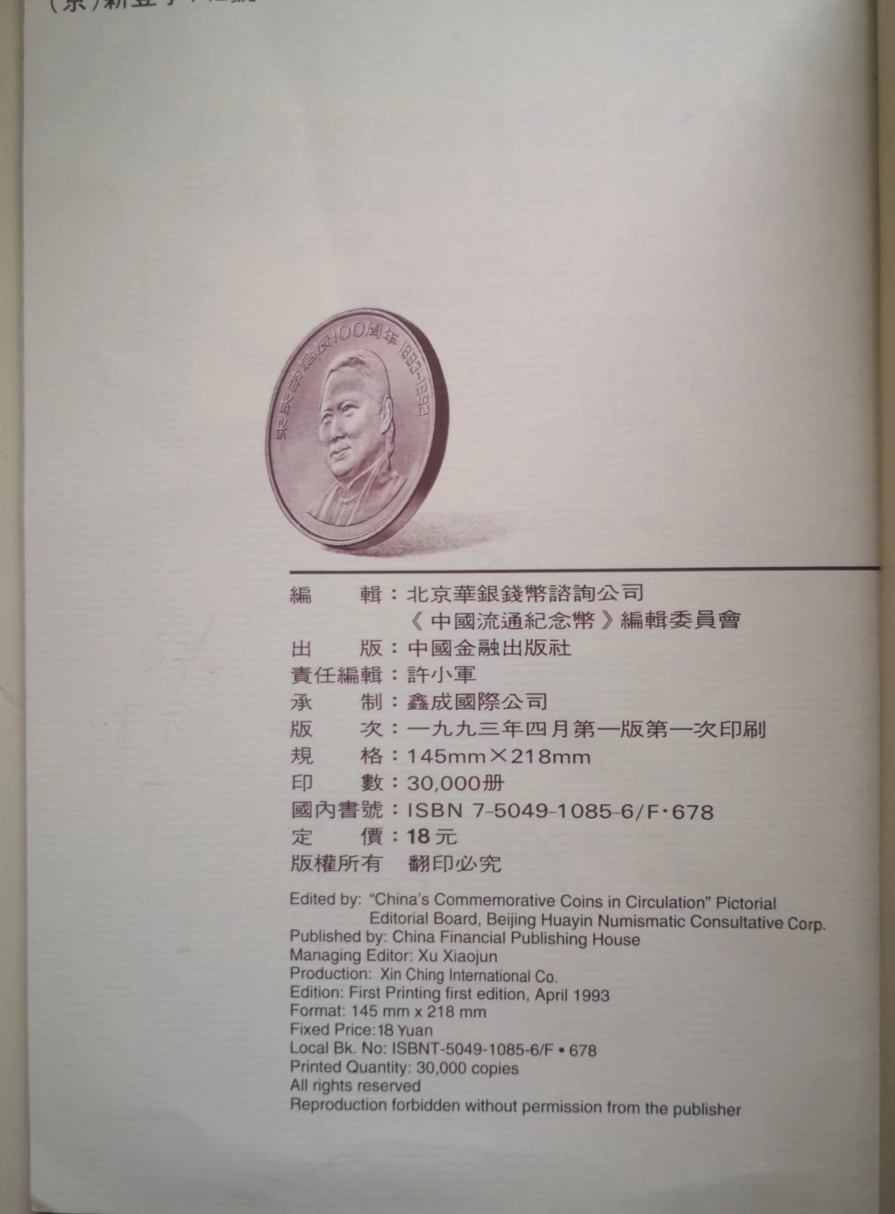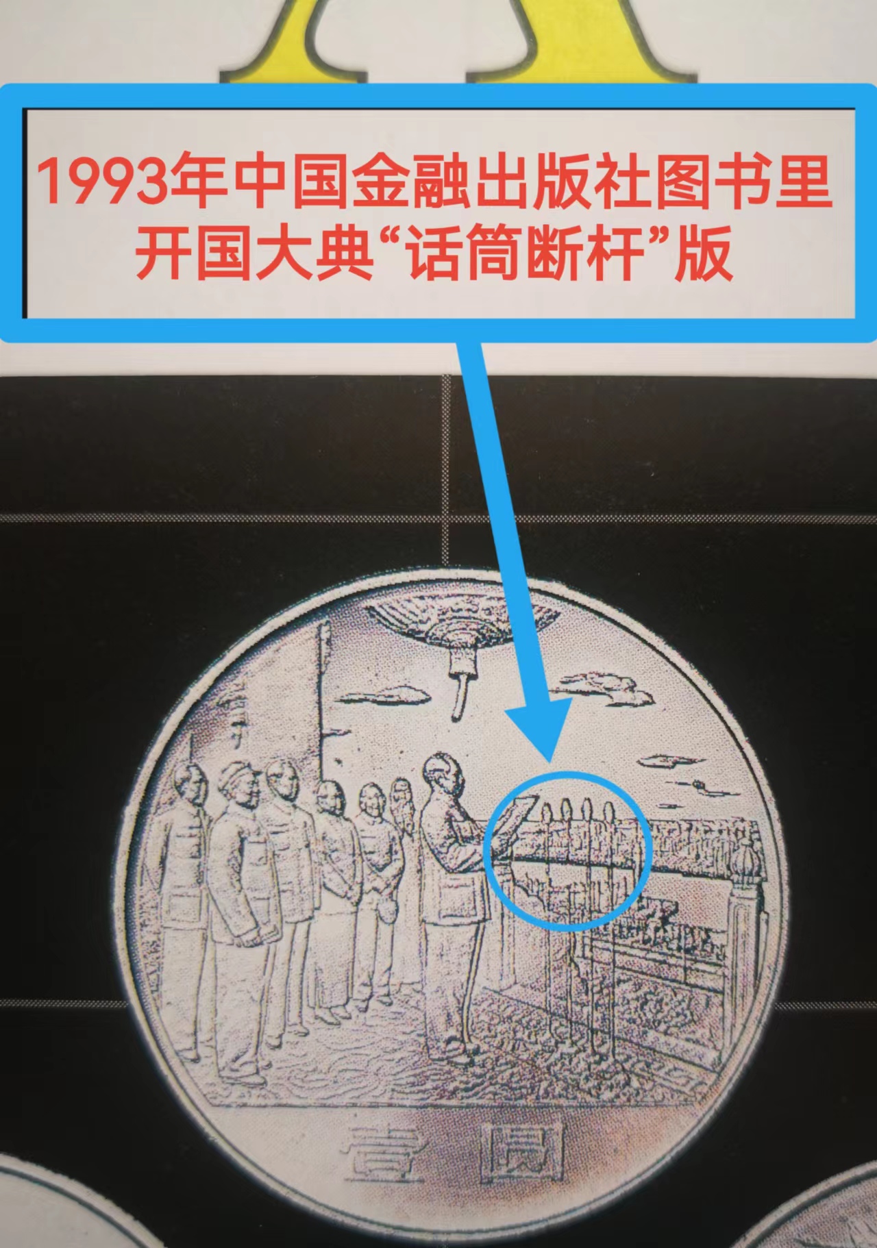 早在29年前的1993年,由官方的中國金融出版社出版的新中國流通紀(jì)念幣一書中,就出現(xiàn)了開國大典紀(jì)念幣話筒斷桿版的清晰照片。