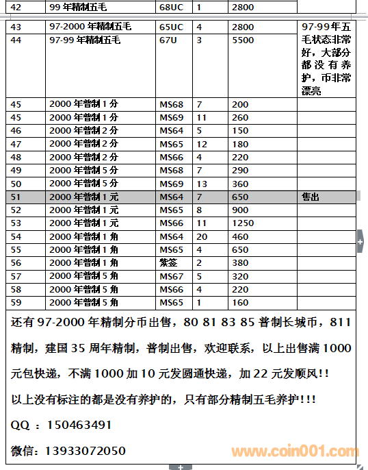 【【【【】】】】集中出手91-2000精普評(píng)級(jí)幣 看上的聯(lián)系,品相都很好,還有97-2000年精制分幣出售,80 81 83 85普制長(zhǎng)城幣,811精制,建國(guó)35周年精制,普制出售,歡迎聯(lián)系,以上出售滿1000元包快遞,不滿1000加10元發(fā)圓通快遞,加22元發(fā)順風(fēng)?。?/font> 以上沒有標(biāo)注的都是沒有養(yǎng)護(hù)的,只有部分精制五毛養(yǎng)護(hù)?。?! QQ :150463491 微信:13933072050 |