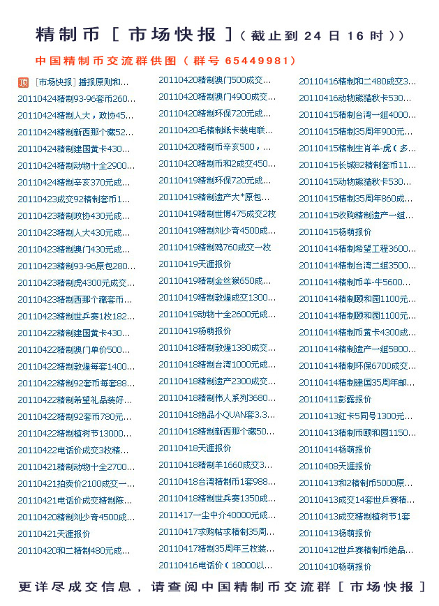 引用 引用第3樓何軍珺于2011-04-24 21:50發(fā)表的 : 成交信息大多是搜集于中國(guó)現(xiàn)代錢(qián)幣網(wǎng)和一塵網(wǎng),大多比較客觀真實(shí),部分交易金額電聯(lián),請(qǐng)自行判斷。